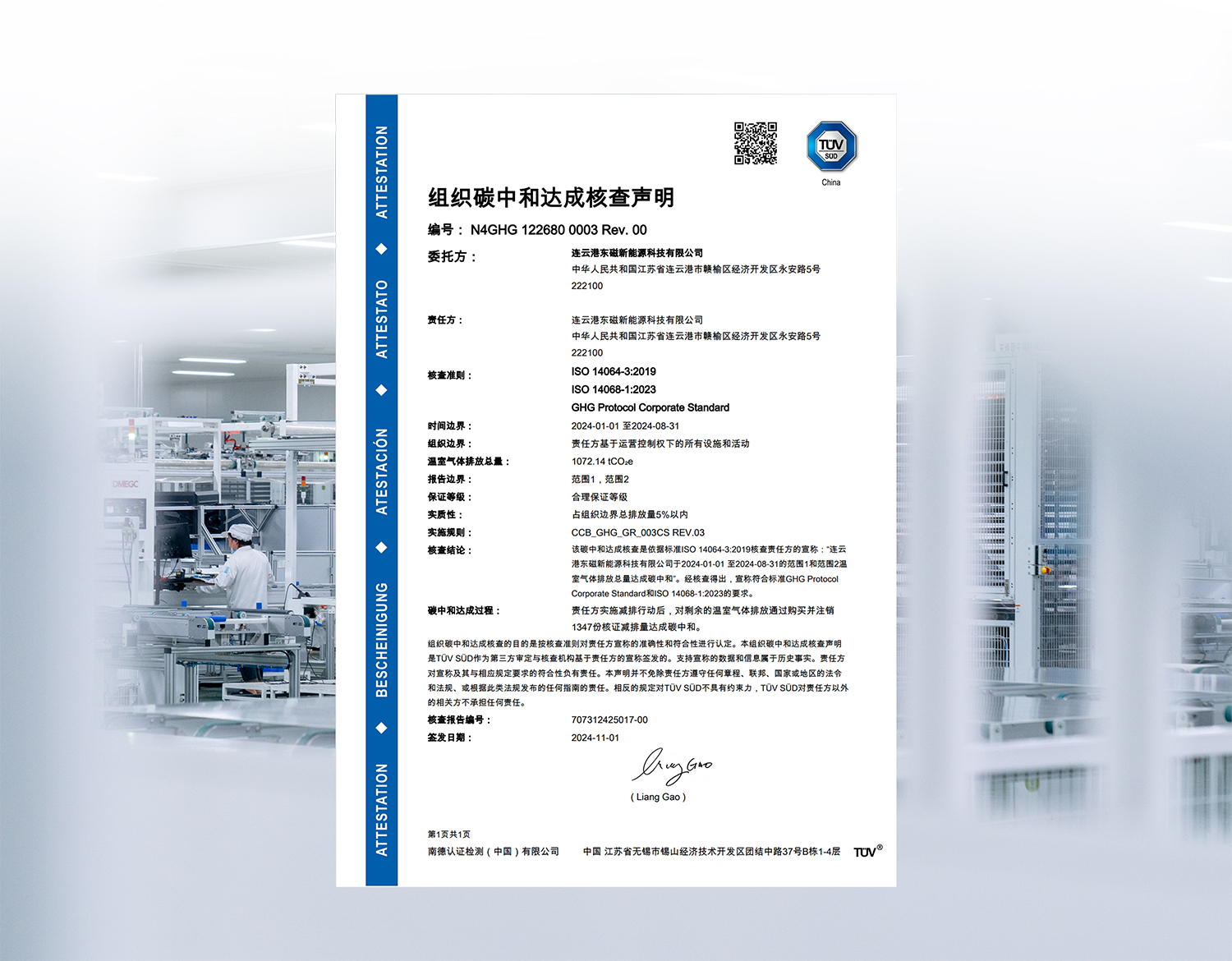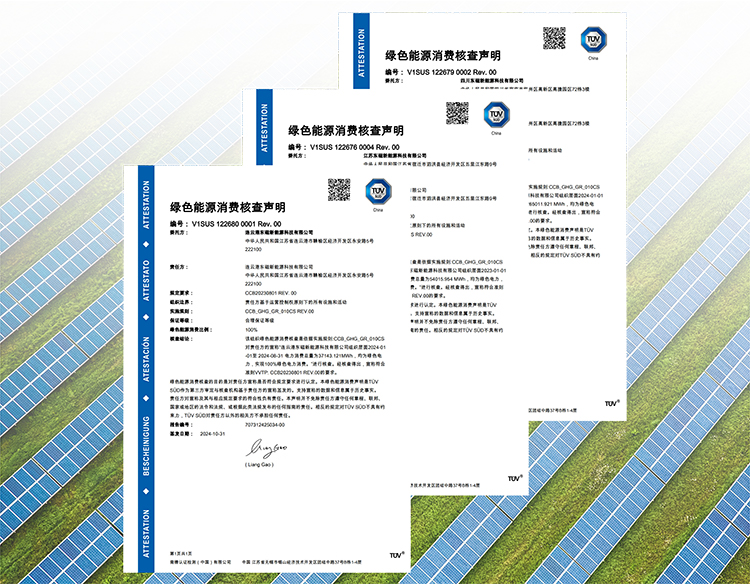 11月1日,橫店?yáng)|磁太陽(yáng)能連云港基地獲得TüV南德意志集團(tuán)(以下簡(jiǎn)稱“TüV 南德”)頒發(fā)的ISO14068組織碳中和達(dá)成核查聲明證書,為TüV南德在光伏行業(yè)頒發(fā)的首張?jiān)擃愖C書。同日,橫店?yáng)|磁泗洪、連云港和宜賓3個(gè)基地還獲得組織溫室氣體核查聲明和綠色能源消費(fèi)核查聲明。